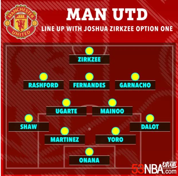 约书亚·齐尔克泽(Joshua Zirkzee)可以在4-2-3-1阵型中击败拉斯穆斯·霍伊伦德(Rasmus Hojlund),成为进攻的头号位置,而曼努埃尔·乌加特(Manuel Ugarte)则与迈努(Mainoo)搭档中场。防守方面,莱尼·约罗(Leny Yoro)与马丁内斯并肩出任中卫,卢克·肖(Luke Shaw)和迪奥戈·达洛特(Diogo Dalot)出任两翼。木门内仍然是守门员安德烈·奥纳纳。